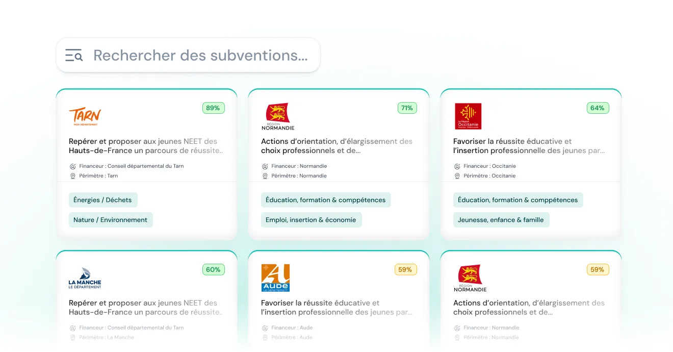 Notre moteur de recherche intelligent scanne en continu les subventions publiques et les financeurs privés pour trouver celles qui vous correspondent.