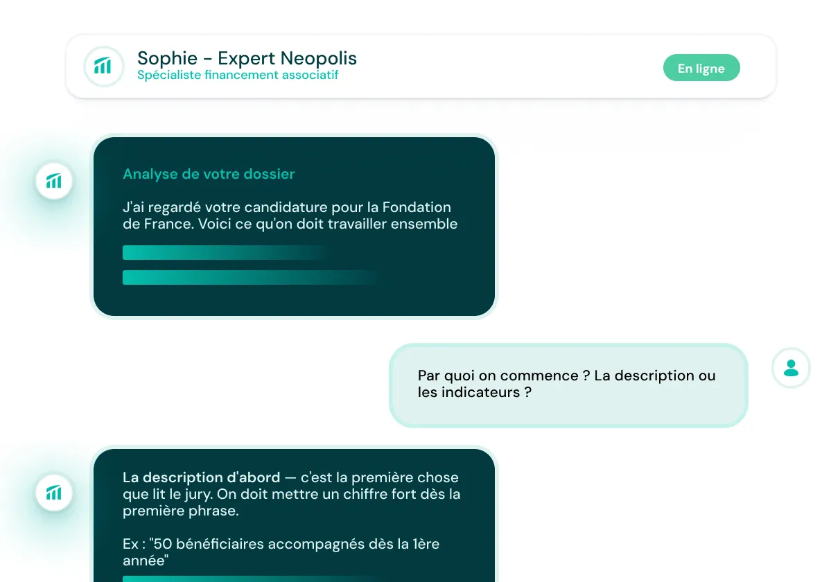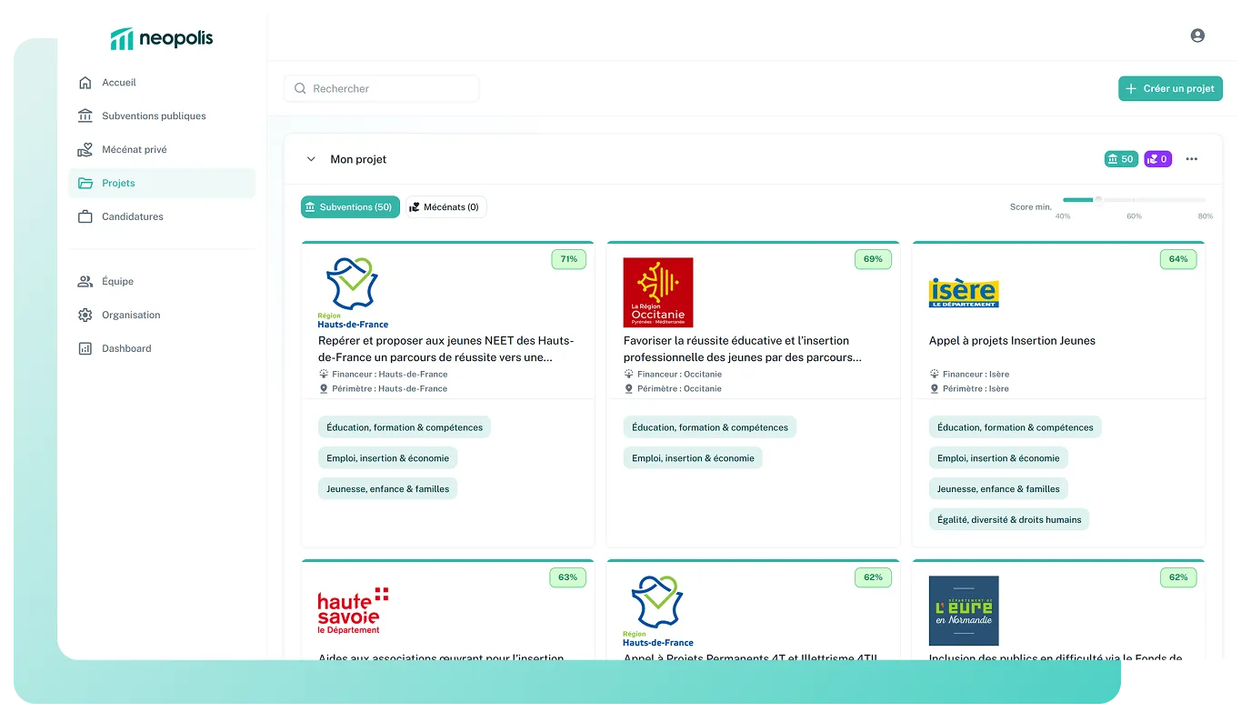 Neopolis repère automatiquement les subventions pertinentes pour vos projets. Et quand il faut passer à l'action, un expert vous guide pour transformer chaque opportunité en financement obtenu.