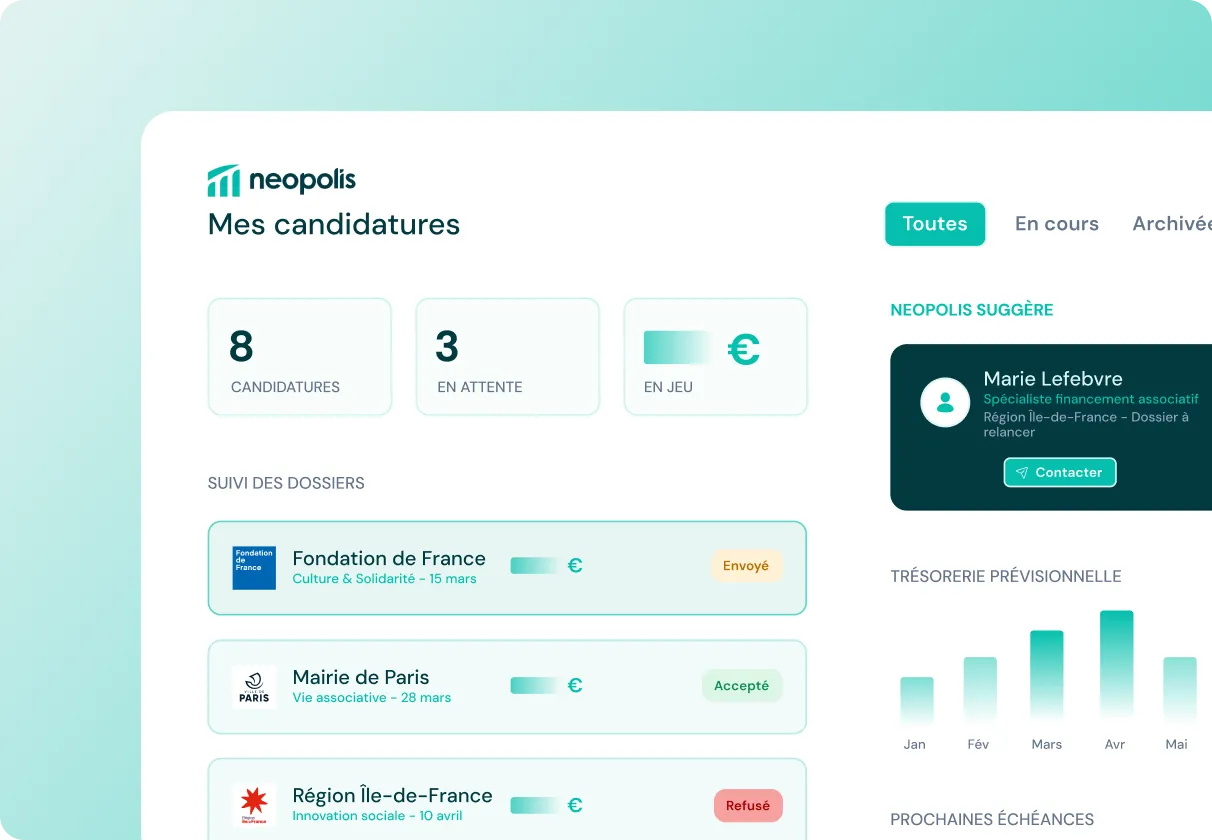 Neopolis identifie les meilleures opportunités de financement pour votre association et vous accompagne dans chaque étape pour maximiser vos chances de réussite.